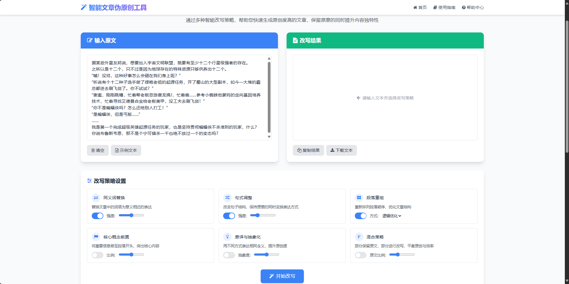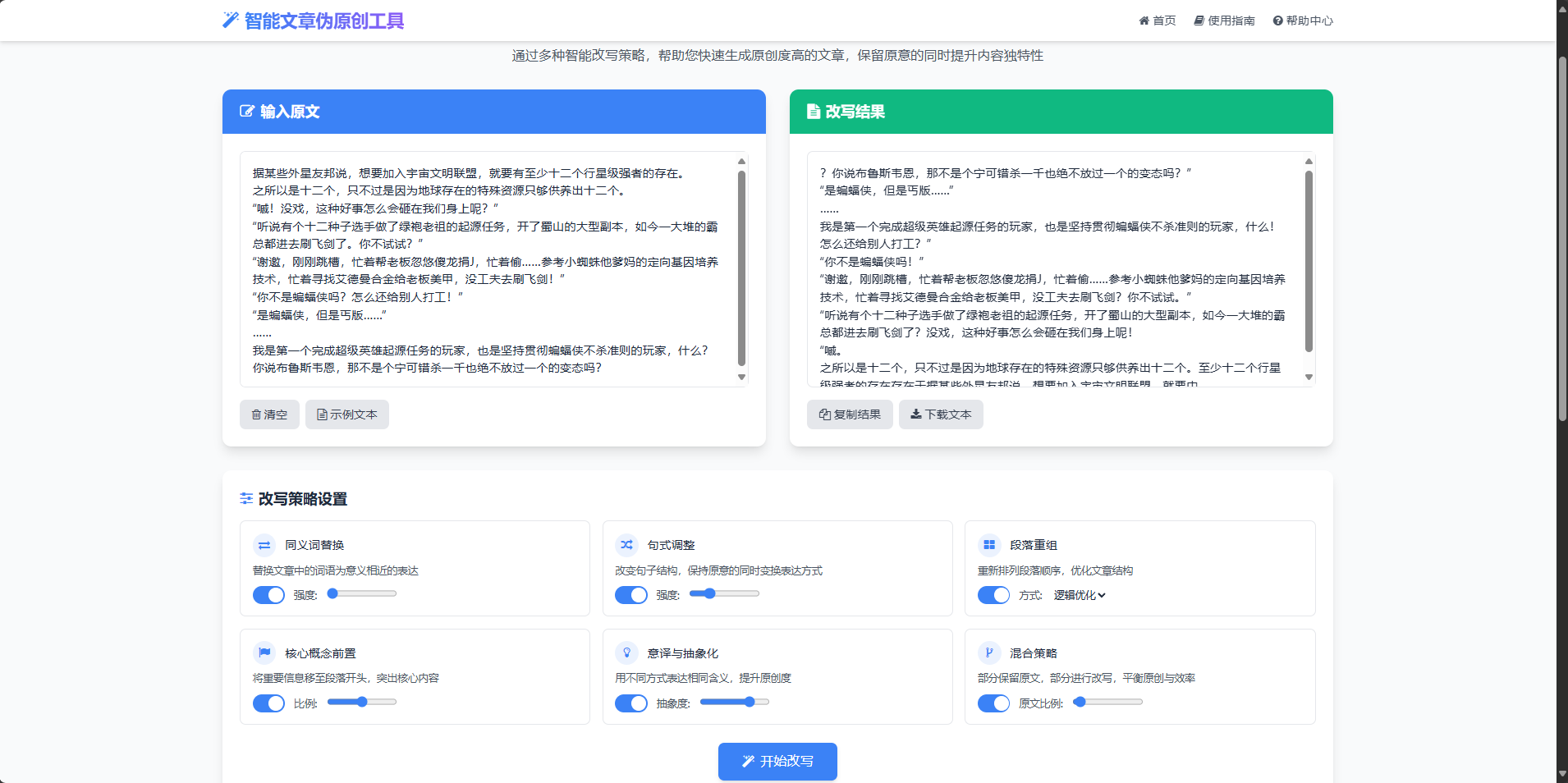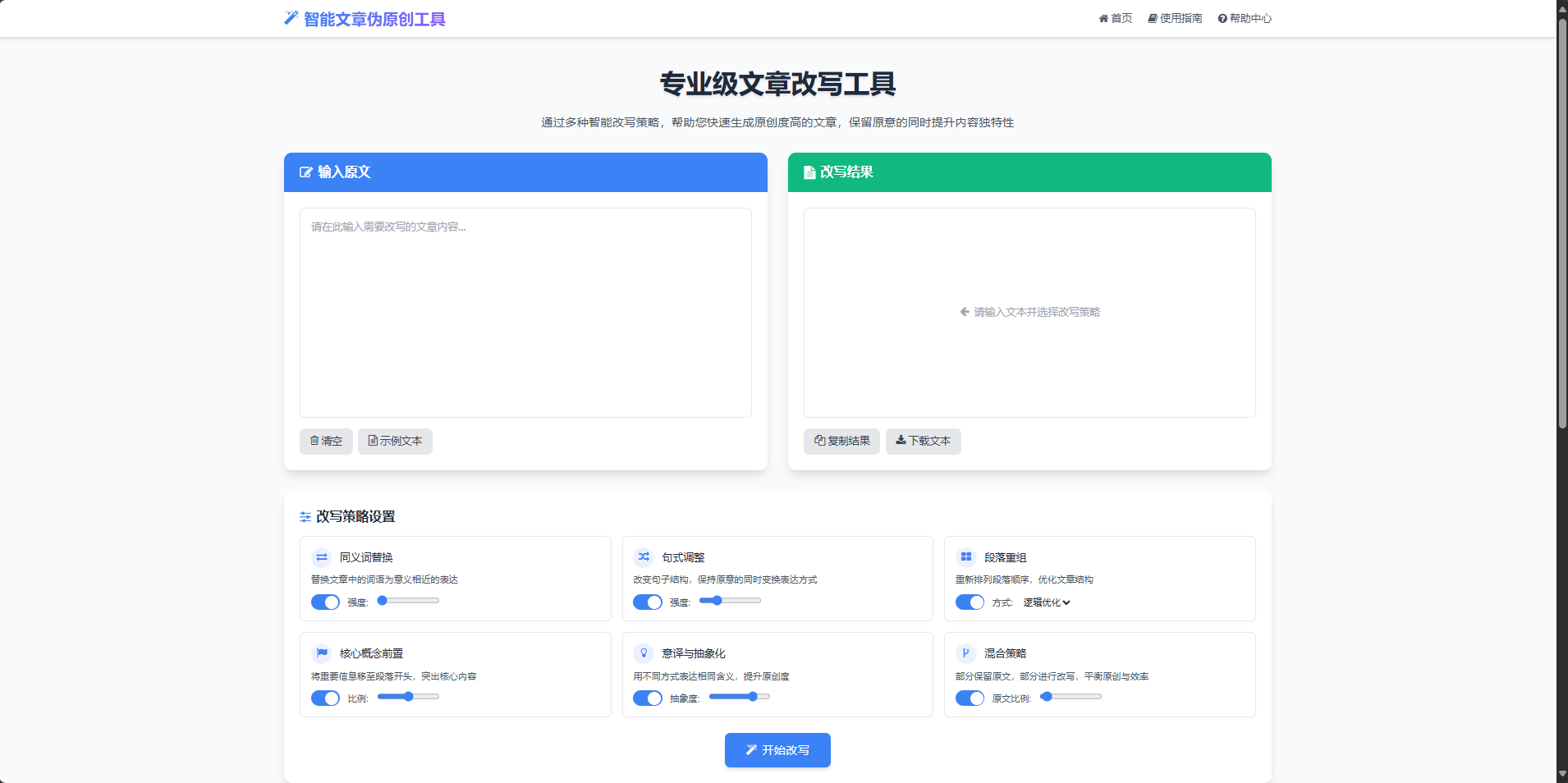 可视化操作界面:采用分区设计,左侧为原文输入区,右侧为改写结果区,中间提供详细的改写策略设置。